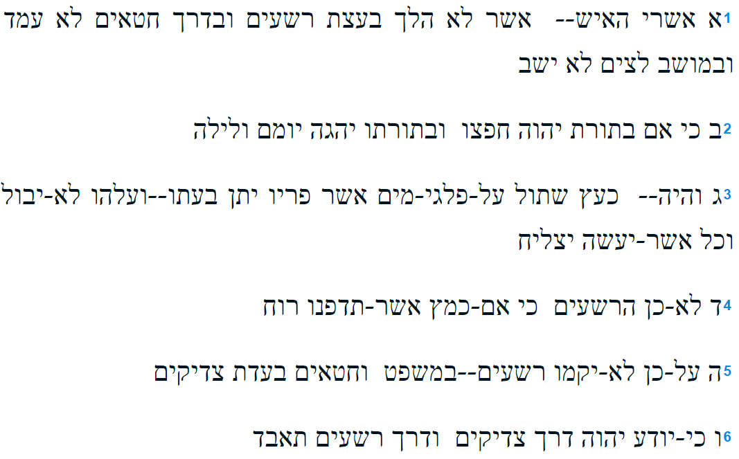 - 1 μακάριος ἀνήρ ὃς οὐκ ἐπορεύθη ἐν βουλῇ ἀσεβῶν καὶ ἐν ὁδῷ ἁμαρτωλῶν οὐκ ἔστη καὶ ἐπὶ καθέδραν λοιμῶν οὐκ ἐκάθισεν